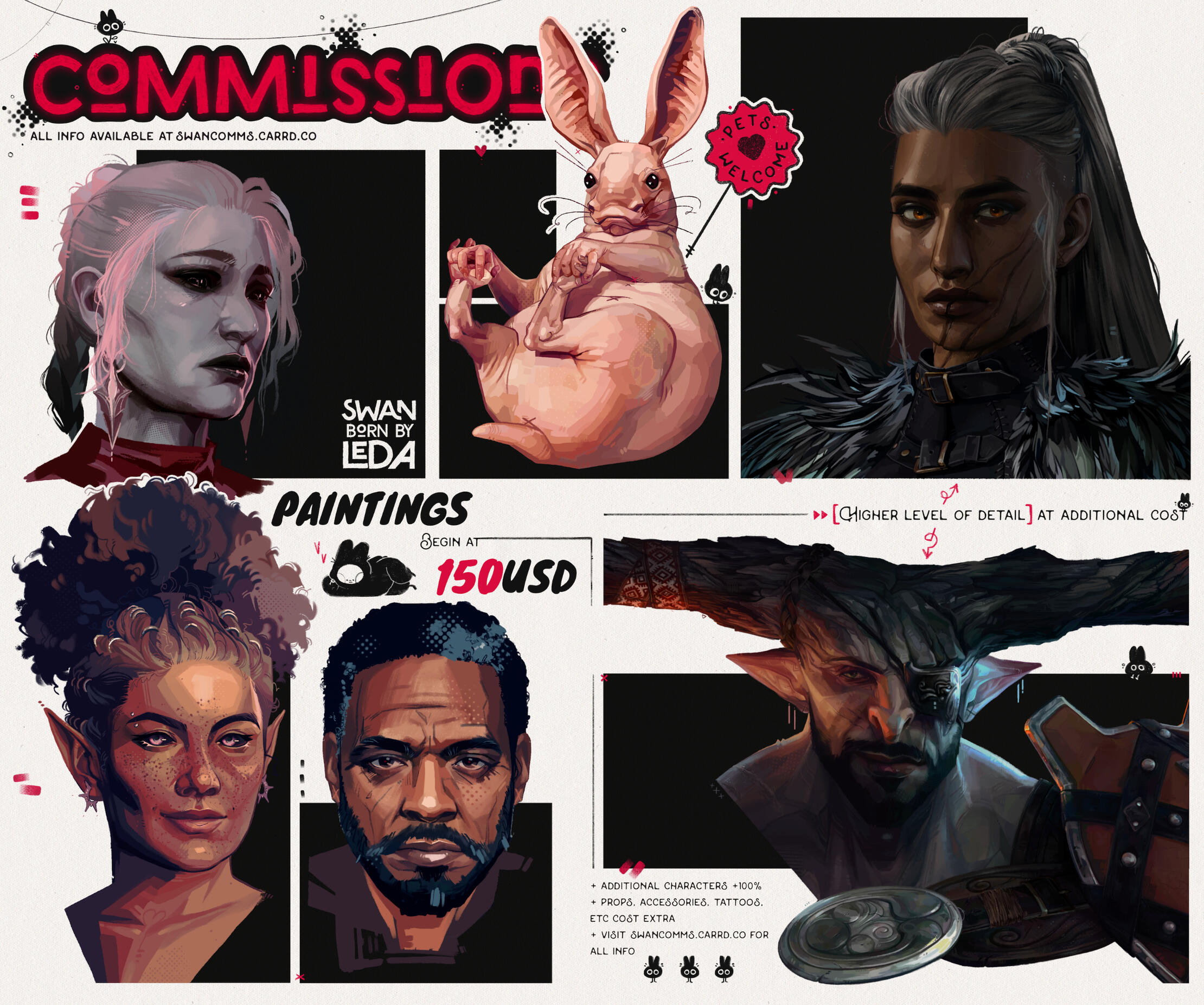You must be 18 years of age or older to commission me. By contacting me with a commission inquiry, you confirm you are at least 18 years of age or older.Payment must be made upfront and made via a Paypal invoice in USD, matching the quoted number. Payment is final and non-refundable.Payment plans can be arranged for commissions upwards of $150 USD. Payment installments are final and non-refundable.Clients who cancel their commission before its final delivery are not entitled to the artwork, regardless of its stage of completion, and will not receive a refund.Rush orders are defined as any commission requiring delivery within 10 business days (Mon-Fri EST) of initial invoicing. Rush orders begin at an additional rate of 50% of the initial pricing, and are subject to increase based upon deadline and commission complexity.These prices are set for personal, private use. Commercial rates must be negotiated.Commissions which cannot be posted to the artist's social media or portfolio by client request are subject to a privacy fee.All rights to the image remain with Swan Born By Leda, the artist, including its distribution and use. Swan Born By Leda retains the right to post the images publicly on any platform they see fit, including but not limited to, their social media accounts and portfolio.There will be a signature present on the artwork so Swan Born By Leda can be identified as the creator of the piece.The final piece will be a digital product in PNG format. Should a specific sizing or format be required, this must be communicated before work begins.PSD files are available by request.Commissioned work may not, under any circumstance, be used in the promotion, minting, or creation and trading of NFTs, FTs, or crypto-currencies of any form.Commissioned work may not, under any circumstance, be uploaded, inserted, and/or willfully and consciously given to the training of AI data sets or AI art engines, including but not limited to applications such as Lensa, ChatGPT, Art Breeder, Stable Diffusion, Midjourney, Dall-E, and more.